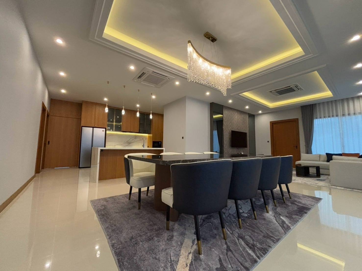 • Open-plan living room and dining area with European kitchen